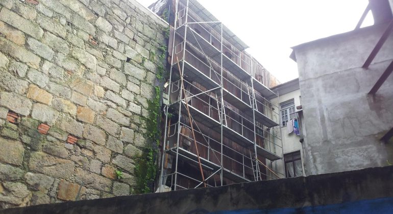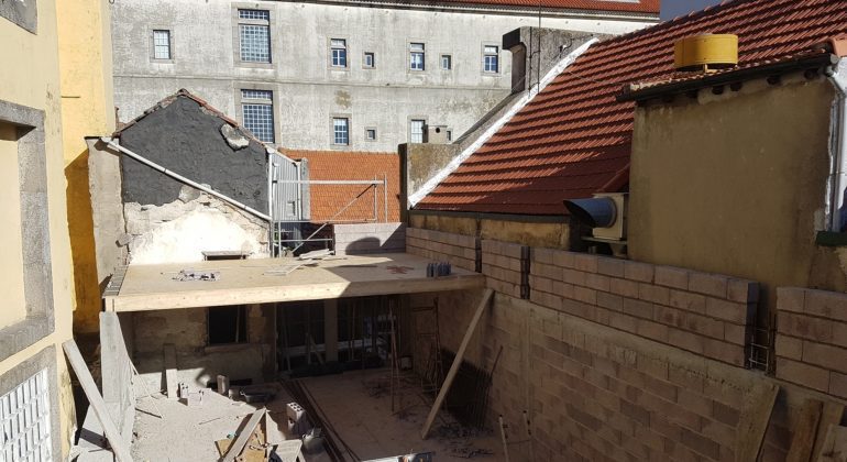 Para colmatar todas as entradas de água no edifício, realizámos a substituição integral das coberturas, reabilitando e substituindo os rufos sempre que necessário, e recuperamos todos os entablamentos.